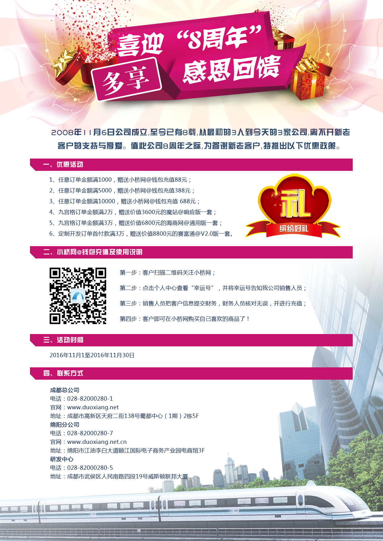 2008年11月6日公司成立,至今已有8载,从最初的3人到今天的3家公司,离不开新老客户的支持与厚爱。值此公司8周年之际,为答谢新老客户,特推出以下优惠政策。