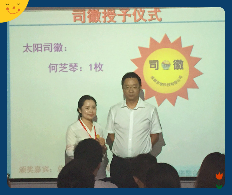颁奖环节结束之后,就是激动人心的司徽授予仪式。客服二部主管何芝琴业绩始终都名列前茅,公司胡总经理授予其太阳司徽奖励其一次国外旅游。