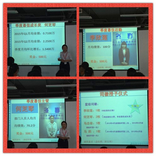 本次季度大会是由来自信贷部的胡润东主持,一直都喜感十足的胡润东主持风格诙谐幽默又不失严谨,将会场控制得井井有条。会议以颁发月度奖励开场,先后颁发了业绩标杆前三甲、销售之星、客服之星以及标杆团队。在此恭喜获奖的小伙伴,希望没能拿奖的同事们千万不要放弃继续加油!